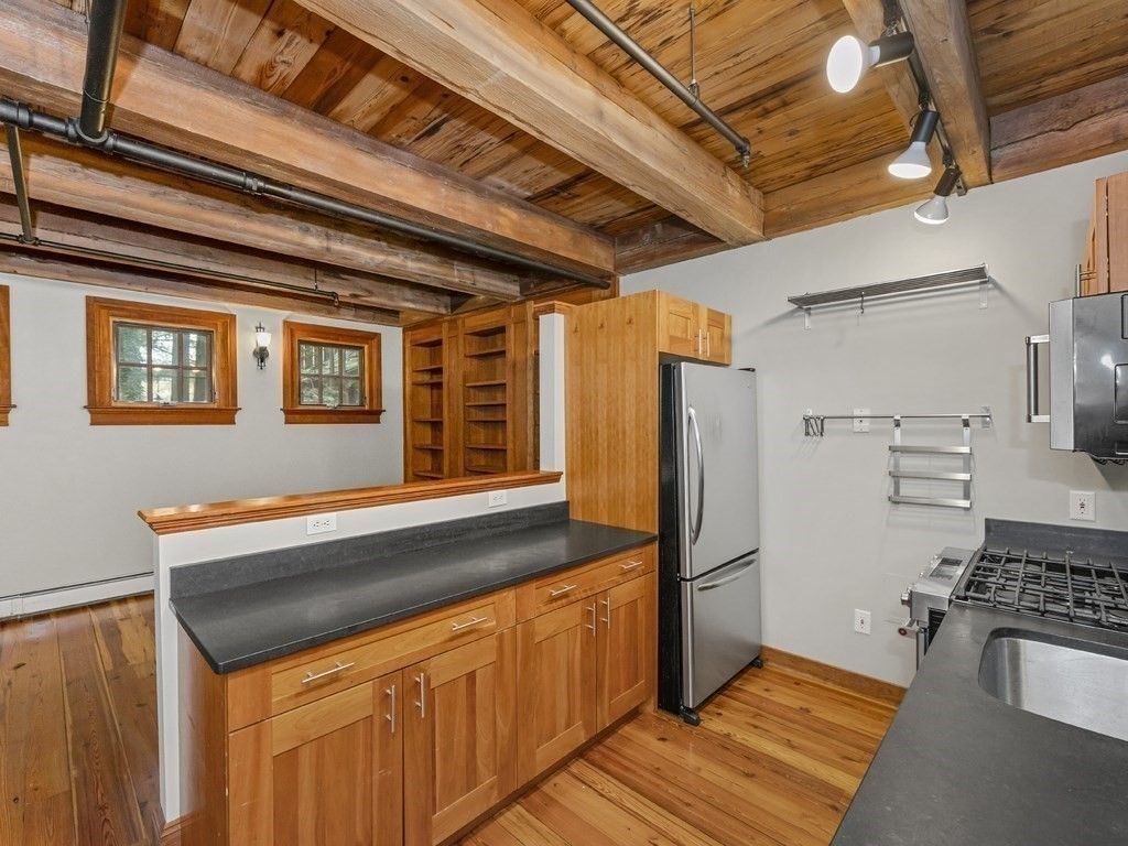 Cambridgeport: Classic David Aposhian Shingle-Style Townhouse. Built new from the ground up in 2002 using reclaimed wood beams along with new mahogany, cherry and fir millwork throughout. Numerous custom built-ins, spacious closets, vaulted-ceilings with skylights, wainscoting and three sides of tall windows. Two full bathrooms, in-unit laundry and hardwood floors, David's trademark Arboretum landscaping is in full play creating lush green environment. The modern kitchen features Shaker-Style cabinets with professional-grade stainless steel appliances and honed-granite counters. Two-car off-street parking directly abutting the unit, efficient gas forced hot water heating and a short walk to Whole Foods and the Charles River. Available for June!